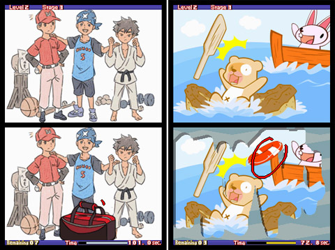 Plus, in concentration mode, you can fully admire how beautiful the in-game images are. You will see namco cameos like pacman or klonoa...awesome stuff. The multiplayer is also a blast, if you have friends to play with, ESPECIALLY that one bomb mode. You have to pass the one DS around your friends and find differences with a ticking bomb, when the bomb runs out, whoever is still holding the DS loses. Scramble mode is alright, its just a matter of who solves more mistakes quicker, but also has its own value of fun.